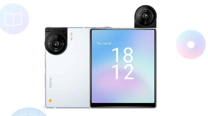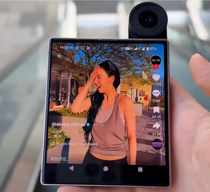 手機(jī)外形被貪圖成訪佛一張銀行卡,正面是一塊接近正方形的屏幕,下巴略寬;后面貪圖很淺顯,只消一顆單錄像頭,何況支柱翻轉(zhuǎn)。