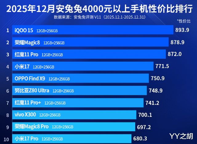 最后,在2025年12月份安兔兔4000元以上手機性價比排行榜中,紅魔11 Pro+和vivo X300分列第七名和第八名。在安兔兔平臺上,這兩款智能手機的性價比評分分別為741.2分和700.1分。在此之后,榮耀Magic8 Pro和小米17 Pro分列第九名和第十名。在安兔兔平臺上,這兩款智能手機的性價比評分分別為697.2分和680.3分。其中,在核心處理器上,小米17 Pro搭載第五代高通驍龍8至尊版移動平臺。這是高通最新的旗艦級移動平臺,號稱“全球最快的移動SoC”。