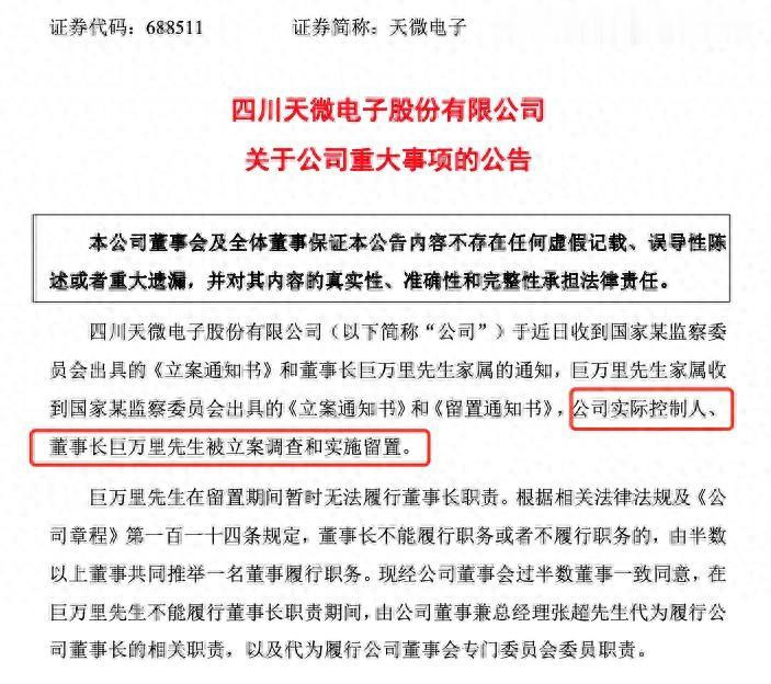 2024年7月,成都雙流區天微電子總部突然接到一份來自國家監察委員會的通知書,公司實控人、董事長巨萬里被立案調查并實施留置。