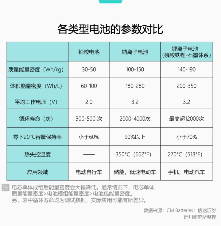 鈉電池雖有成本低和低溫性能好的優點,但也有一個相當致命的缺陷:能量密度低。能量密度是決定電池續航的關鍵指標,可以理解為電芯在單位質量提供的能量。2021年寧德時代發布第一代鈉電池,僅僅公布了電芯單體能量密度為160Wh/kg,該數據落后于磷酸鐵鋰電池,更不用說能量密度200Wh/kg以上的三元鋰電池。根據遠川研究所整理的數據,可見鈉電池性能僅好于鉛酸電池,比磷酸鐵鋰和三元鋰電池均有明顯劣勢。