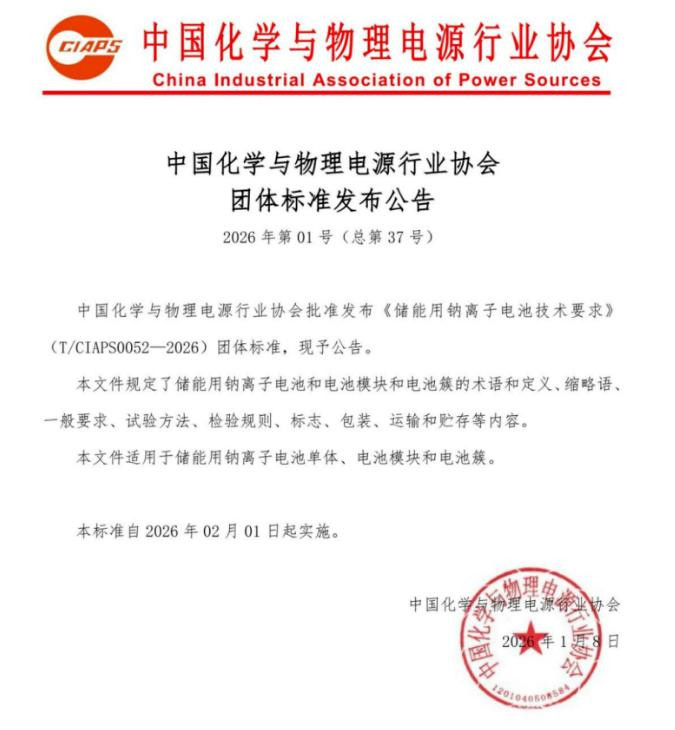 并且按照寧德時代的說法,第二代鈉電池單體能量密度達到175kWh/kg,已經和磷酸鐵鋰不相上下,可以滿足大部分市場需求。而在政策端2026年1月8日,中國化學與物理電源行業協會正式發布2026年第01號(總第37號)團體標準公告——《儲能用鈉離子電池技術要求》(T/CIAPS0052—2026),并明確將于2026年2月1日起正式實施。并且國家《新型儲能規模化建設專項行動方案(2025—2027年)》已將鈉離子電池儲能明確列為重點發展方向之一。