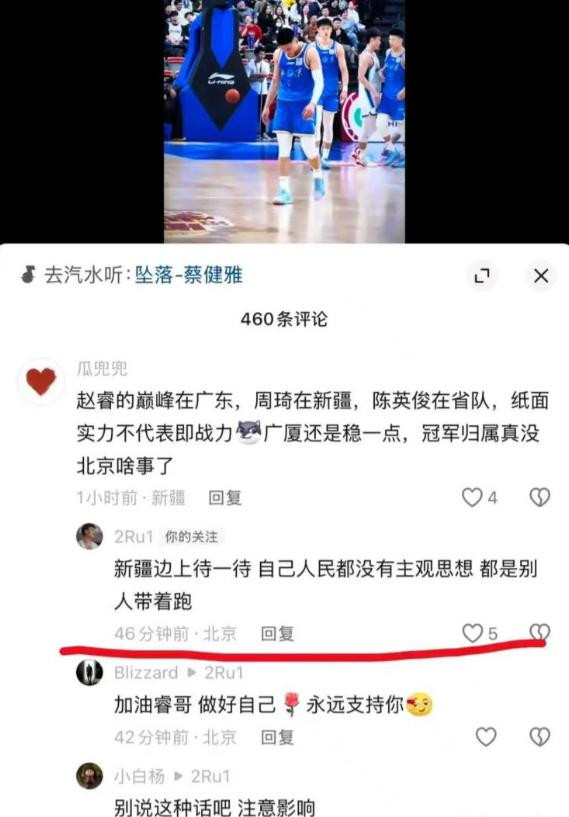 還有新疆球迷理性分析球隊實力,說北京隊奪冠沒戲,趙睿更狠,直接回新疆邊上待一待,自己人民都沒有主觀思想,都是別人帶著跑,引新疆官媒發聲怒批。