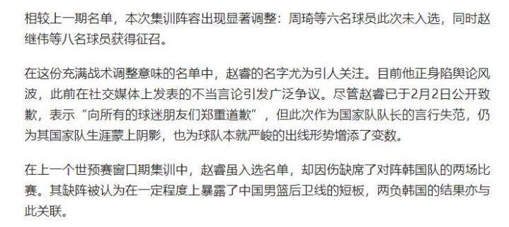 更讓這事充滿懸念的是,2月3號中國籃協公布男籃世界杯預選賽集訓名單,趙睿的名字赫然在列。