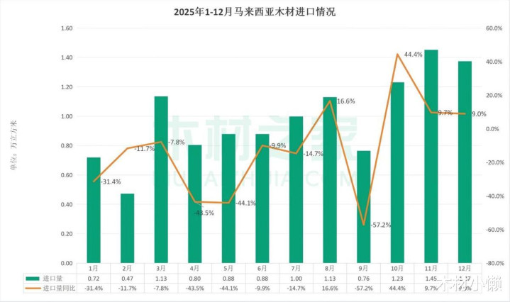 2025年,中國入口馬來西亞木料入口舉座呈現 “量減價增”的特征。
