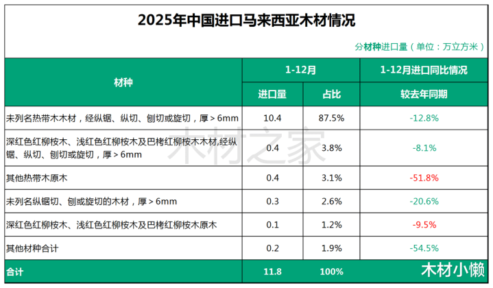 2025年中國從馬來西亞入口木料總量中,熱帶木木料占據都備主導,入口量10.35萬立方米,占比高達87.5%。部分材種入口發達: