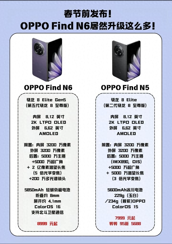 1:隨著春節臨近,OPPO即將發布的Find N6引發了廣泛關注。通過對比Find N6與前代Find N5的參數配置,可以發現這款新機在處理器、影像系統、電池技術、通信能力及細節體驗上實現了全方位升級。從驍龍8至尊版的迭代到衛星通信的加入,Find N6不僅延續了大屏折疊的基因,更在核心功能上實現了突破,為高端移動設備樹立了新標桿。