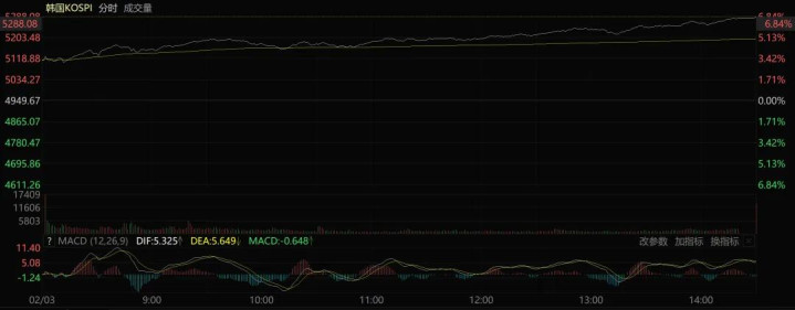 2月3日早上,韓國股市開盤后一掃昨天頹勢,在三星、SK海力士帶領下,全天高開高走,收盤暴漲6.84%。