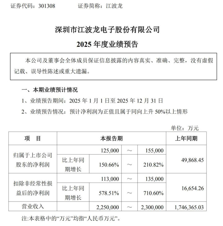 其中最受關注的似乎是江波龍,這家公司上周發布了2025年業績預告。預計全年營業收入225億元至230億元,同比增長約28.8%至31.7%;預計歸母凈利潤12.5億元至15.5億元,同比增長150.66%至210.82%;預計扣非凈利潤11.3億元至13.5億元,同比增長578.51%至710.60%。