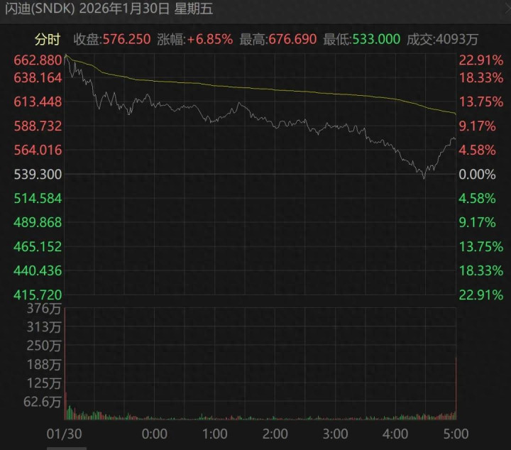 上周五的美股,閃迪在公布了炸裂的財報之后,大幅高開20個點以上,不過之后一路跳水一度收綠,尾盤又漲回來一點,收盤上漲不到7%。